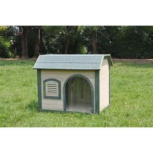 The Large Garden Style Dog House is perfect for your back yard. The roof of this spacious house is made of weather-proof shingle material and the window opens for ventilation. Door flaps are included to protect your pet from bugs and rain while the slightly raised base helps keep them dry. Sturdily constructed of Fir wood finished with dark green trim, these houses are meant to last. The cellular structure of wood allows it to withstand extreme temperatures and humidity, and its natural insulation keeps pet warm in winter and cool in summer. Approx. 30 min. assembly is required; easy to follow instructions and hardware included. Dimensions: 46' x 30.5' x 39.5'.